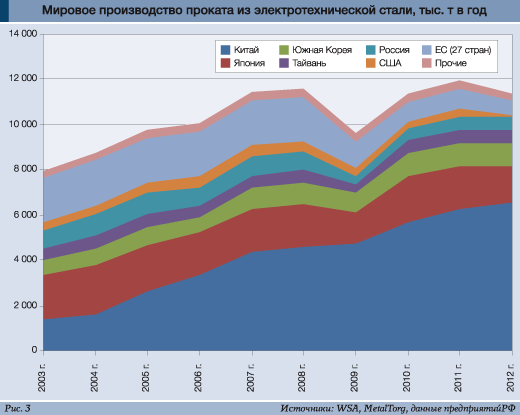 Но перераспределение производства электротехнической стали как в России, так и во всем мире за последнее десятилетие произошло более чем ощутимое. Приведем динамику основных производств по данным World Steel Association (WSA), дополнив их цифрами по России (рис. 3).