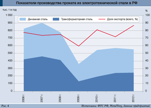 Внутри РФ прошла заметная (до признаков монополии) консолидация производства. Почти весь выпуск металлопроката из электротехнической стали (около 90%) сосредоточился в группе НЛМК (на липецкой и верх-исетской площадках). Причем растет специализация: «ВИЗ-Сталь» все больше выпускает трансформаторную сталь, а НЛМК – динамную.