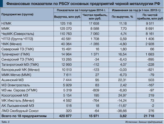 Тем не менее, как металлургии, так и металлоторговле за полугодие удалось повысить внутренние цены большинства видов стальной продукции на 15–20%. Что при стабильных объемах сбыта, естественно, помогло финансовым показателям II квартала и первого полугодия 2014 г. в целом (табл. 5).