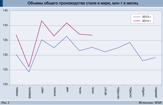 По итогам января–июня 2014 г. производство стали (проката, труб и метизов) выросло в большинстве регионов мира и в большей части «металлургических» стран. Суммарный объем выплавки стали вырос на 3,9%, причем позитивной является и помесячная динамика мировой черной металлургии (рис. 1).