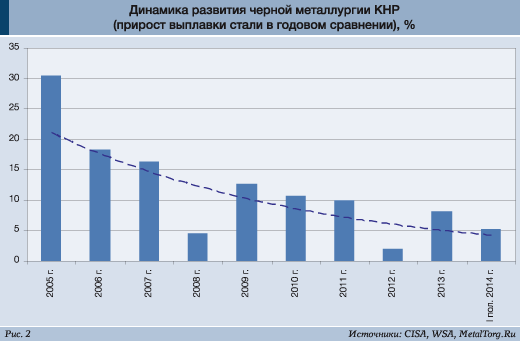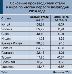 По итогам первого полугодия 2014 г. (по данным Государственного статистического управления КНР) в стране было произведено 411,9 млн т стали, что на 3% больше, чем годом ранее. По данным WSA, этот рост еще выше и составляет 5,3%. Однако видимое (с учетом экспорта/импорта) китайское потребление стали за первое полугодие 2014 г. выросло всего лишь на 0,4%, до 376 млн т.