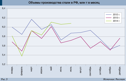По данным Росстата, динамика производства в черной металлургии РФ выглядит позитивно. По сравнению с аналогичным периодом прошлого года объемы производства чугуна выросли на 0,1%, стали – на 1,7%, проката – на 1,3% и стальных труб – на 2,6%. Однако помесячная динамика российского производства в январе–июне (как по данным Росстата, как и по данным WSA) по сравнению с 2013–2014 гг. выглядит сравнительно нестабильной (рис. 3).