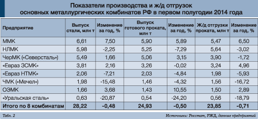По данным некоммерческого партнерства «Русская сталь», объединяющего ведущие метпредприятия РФ, за первое полугодие 2014 г. производство стального проката увеличилось на 1,31%, до 27,8 млн т.