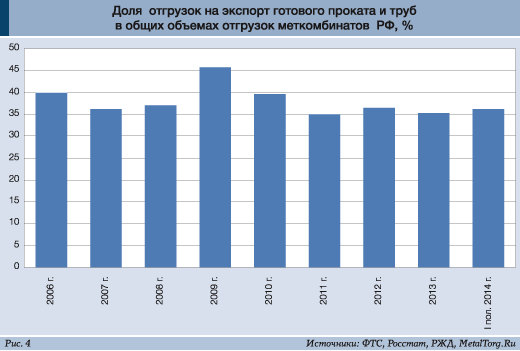 Как мы уже указали выше, рост производства стального проката (включая полуфабрикаты) за первое полугодие составил в РФ около 1,3% в сравнении с аналогичным периодом прошлого года. При этом, по данным ФТС, экспорт черных металлов из страны за этот период увеличился на 6,6%, до объемов 19,56 млн т, а по стоимости – на 2,2%, до $10,3 млрд. Подъем этот не слишком значителен, поскольку фактически речь идет о стабилизации доли экспортных отгрузок российской металлургии на уровне около 35% (рис. 4).