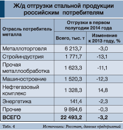 Исходя из объемов основных ж/д отгрузок в адрес крупнейших предприятий различных отраслей, роста спроса на металл в России нет нигде, кроме нефтегазового комплекса (табл. 4).