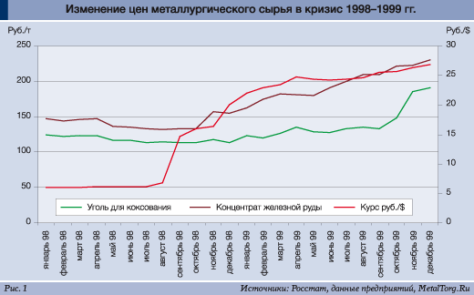 Старт роста российских цен железной руды (на 10–15%) состоялся с опозданием на пару месяцев (в октябре 1998 г.), но продолжался почти полтора года. В итоге рост составил 57,1% в рублях (на фоне роста курса доллара с января 1998 г. на 347%). Сравнительно резвый подъем цен этого сырья объяснялся его вывозом из страны ввиду дефицита железорудного концентрата на внешних рынках. Уже в 1998 г. нашим горнякам удалось увеличить его экспорт на 23,2% в годовом сравнении, до 10,1 млн т.