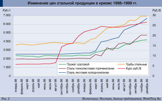 Российские цены стальной продукции в 1998 г. поначалу практически никак не отреагировали на взлет курса доллара. Причиной был существенный спад платежеспособного внутреннего спроса на металл и его фактического потребления. За этот год спад производства готового стального проката в РФ составил 9,8%, а стальных труб – 20%.