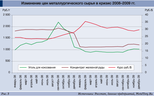 В части металлургического сырья попытку заметного роста внутрироссийских цен предпринял только коксующийся уголь. Именно тогда Владимир Путин пообещал «прислать доктора» и «зачистить ситуацию» в группе «Мечел» Игоря Зюзина. Эту компанию обвинили в манипулировании ценами на угольном рынке – поставках российским потребителям дороже, чем на экспорт. В итоге под давлением падающего спроса (и многих прочих факторов) рост внутрироссийских цен металлургического сырья в кризис 2008–2009 гг. не состоялся вообще. Наоборот, последовал их спад (рис. 3).