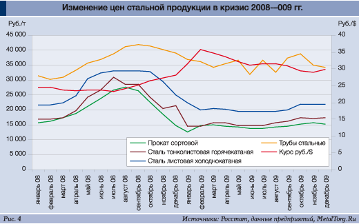 И естественно, негатив охватил основную конечную продукцию горно-металлургического комплекса РФ – стальной прокат, трубы и метизы. Отметим, что их внутрироссийские цены, аналогично углю и коксу, предприняли попытку повышения в 2008 г. Причем досрочно, с опережением снижения валютного курса рубля (рис. 4).