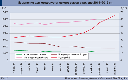 При этом затраты на сырье в рублевом исчислении у нашей черной металлургии в течение 2014 г. практически не менялись (рис. 5).