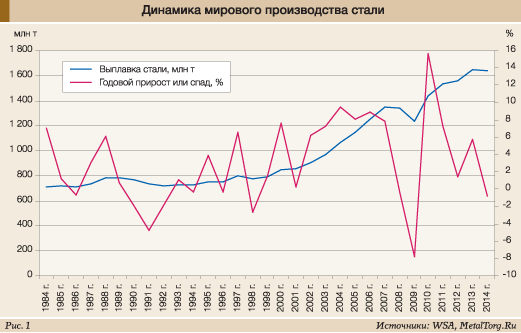 Конъюнктура мирового рынка стальной продукции в прошедшем, 2014 году явно пошла на спад. Металлургам хочется надеяться, что это кратковременный кризис, как в 2009 году. Хуже другое – сейчас наблюдается немало признаков того, что это долговременный процесс, который положит конец динамичному развитию черной металлургии мира в последние 15 лет (рис. 1).