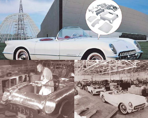 Не осталась в стороне и бытовая техника широкого применения. В 1944 году Owens Corning создала первый полностью стеклопластиковый корпус для лодки. Далее появились стеклопластиковые рыбацкие удочки, подносы, стулья и т.п. А в 1953 году совместно с General Motors был показан первый автомобиль с корпусом из стеклопластика – Chevrolet Corvette самого первого поколения (фото 2).
