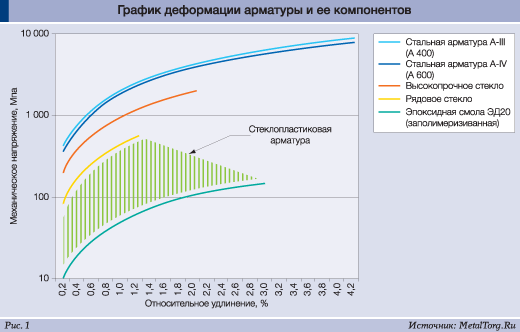 Практически все связующие стекло синтетические смолы и компаунды (эпоксидные, полиэфирные и т.д.) имеют модуль упругости ниже 10 ГПа. Как мы уже отмечали, композитная арматура при изготовлении получит жесткость именно в интервале между показателями стекловолокна и полимера – в зависимости от качества производства. Но в любом случае очень низкую по сравнению со сталью (рис. 1).