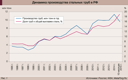 Последние два десятилетия российский выпуск стальных труб развивался опережающими металлургию темпами и вырос практически втрое. Россия вышла на 2-е место в мире по этому производству, уступая только Китаю. Также почти втрое выросла доля российской стали, перерабатываемой в трубную продукцию (рис. 1).