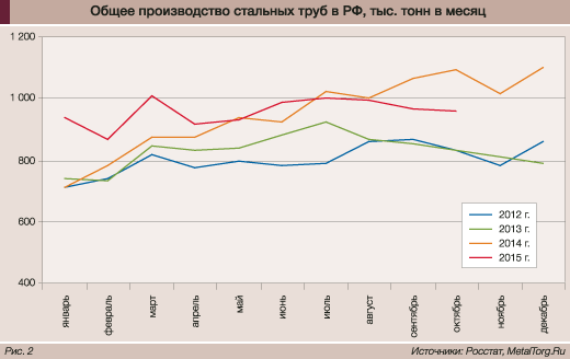 По сообщению Росстата, в октябре текущего года выпуск труб в РФ снизился на 8,9% к октябрю 2014 года и на 0,3% по сравнению с предыдущим месяцем, хотя сравнение показателей тоннажа (по данным того же Росстата) дает несколько иные цифры. Но в любом варианте это явный спад, причем весьма заметный к пиковому уровню трубного производства годом ранее.
