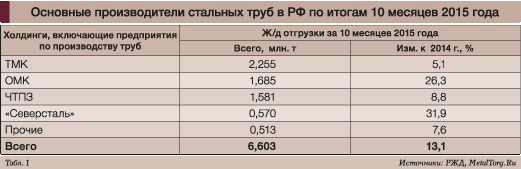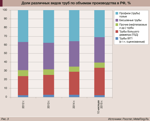 Во-первых, сравнительно стабильную, но падающую долю занимает производство бесшовных труб нефтегазового сортамента и других ответственных (по прочности и коррозионной стойкости) применений. По итогам 2014 года и 10 месяцев 2015 года их доля в общем тоннаже выпуска стальных труб в РФ снизилась до 29,3%, но по суммарной стоимости доля этой группы по-прежнему близка к трети рынка.