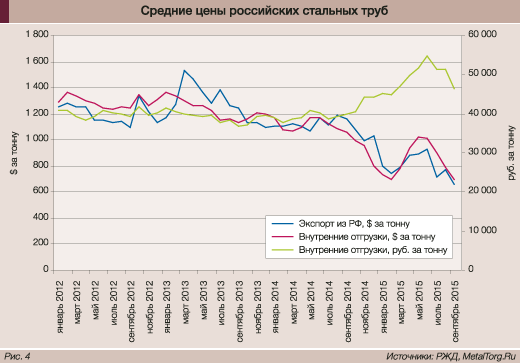 Аналогичное изменение цен (в пересчете на доллары США) произошло для стальных труб, поставляемых на внутрироссийский рынок (рис. 4).