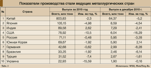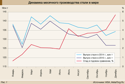 Большинство аналитиков отрасли особенно отмечает неуклонное нарастание темпов спада производства черной металлургии мира в прошедшем году, которые достигли наибольшего негативного значения (-5,7%) в декабре 2015 года.
