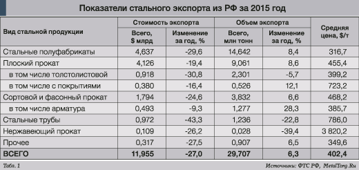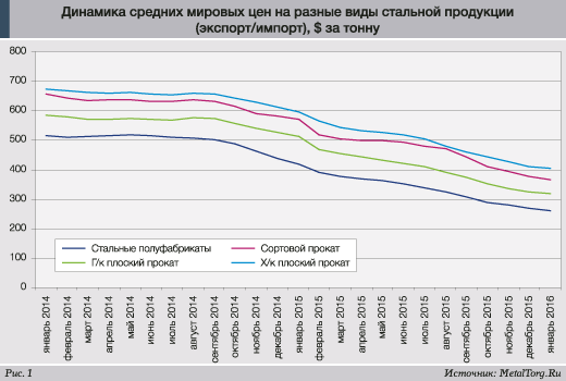 Отметим особо, что опережающий спад цен на стальные слябы и заготовки в 2014–2015 годах был вызван явным демпингом украинской продукции. Китайские поставки (ввиду наличия экспортных пошлин) на этом рынке почти отсутствовали, а недорогие поставки из Бразилии и т.п. стран были ограничены дальними расстояниями. Однако Украина за 2015 год довела долю экспорта до 90% от объемов произведенной в стране стальной продукции, причем основную часть (до 5,2 млн т) составляли поставки стальной заготовки. Тем не менее сокращение валютной выручки украинских меткомбинатов от экспорта за год составило рекордные 38,5%.