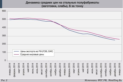 Причем в российском экспорте стальной продукции доля последнего вида продолжила свой рост. По итогам 2015 года, по данным ФТС РФ, она достигла ровно трети по тоннажу. Сам объем экспорта полуфабрикатов при этом вырос на 8,4%, до 1,464 млн т. Однако суммарная стоимость этих поставок из РФ за год, наоборот, снизилась на 29,6%, до $4,637 млрд. Причем ни о каком демпинге здесь речи не идет – экспорт, с учетом стоимости доставки, шел по вполне конкурентным мировым ценам (рис. 2).