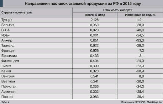 Но увы – по всем позициям размер валютной выручки также падал, даже невзирая на позитивное изменение тоннажа поставок некоторых видов сталепроката. Однако главная проблема российского стального экспорта не в этом. Она – в основных и традиционных направлениях наших поставок (табл. 2).