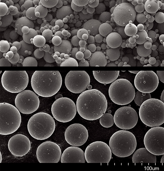 Ее средний размер, например для сплава ЭП648, близок к 30 мкм, что хорошо согласуется с нужной точностью дальнейшей SLM-печати. При этом выход годной фракции металлического порошка (размером 10–40 мкм, сферической формы, без посторонних включений) может быть доведен до уровня 50% и выше. Для этого требуется тщательная подготовка и предварительный разогрев газа-распылителя, стабилизация всех режимов работы атомайзера и т.п. Резервом производства остаются многочисленные прочие методы (и оборудование) для отсортировки нужных фракций порошка (Фото 7).