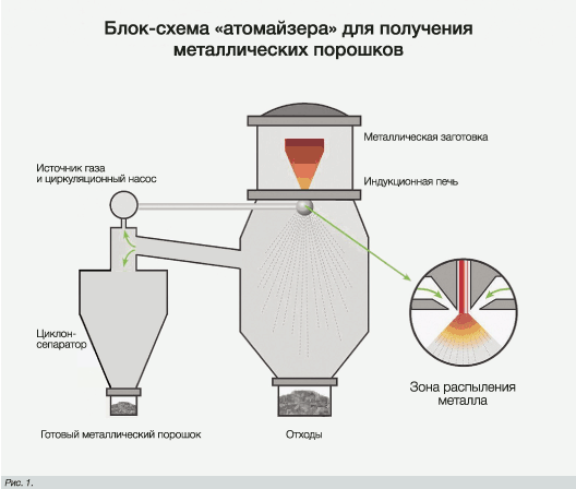Базовая блок-схема комплекта оборудования для газового распыления металлических порошков (атомайзера) приведена на рис. 1. Она всегда включает охлаждаемую систему механической подачи исходной заготовки металла или сплава, как правило – цилиндрической формы диаметром 10–50 мм и длиной до 1 м. Ниже находится зона индукционной печи, обеспечивающей расплавление материала до состояния капельного падения. Применение системы тигельной плавки (более загрязняющей металл) в последние годы заметно сокращается. Ниже зоны плавления находится сопло, распыляющее металл мощным потоком инертного газа.