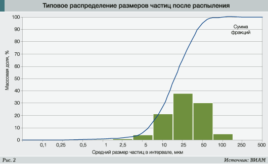 Отработанный в ВИАМе ряд режимов распыления для широкого набора конструкционных металлов дает следующее типовое распределение готовой фракции порошков по размеру (рис. 2).