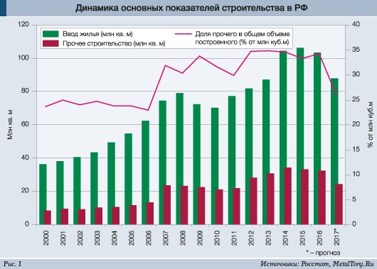 Cтатистика весьма металлоемкой отрасли – российского строительства – в 2016-м и, особенно, в текущем году не внушает оптимизма. Прошлогодний спад ввода жилья в РФ на 2,6%, до 135,8 млн кв. м, кажется сейчас незначительным. Прогноз на весь 2017 год, исходя из показателей I квартала, выглядит заметно более негативным.