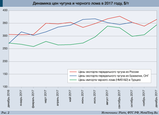 Все это означает, что затраты черной металлургии мира на сырье в 2017 году ничуть не увеличились, т.е. основанием для роста стальных цен не являются. Однако эта тенденция прошедшего года принципиально меняется уже на первом переделе металлургии – в производстве чугуна (рис. 2).