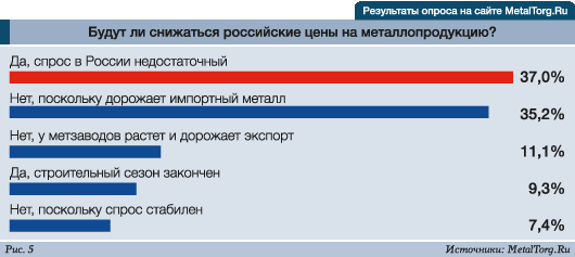 Далее, в ноябре и начале декабря, под давлением слабого спроса вновь последовал откат внутренних цен на уровень начала 2017 года. А мнения участников рынка о текущей тенденции (по данным опроса на MetalTorg.Ru) разделились практически поровну (рис.5).