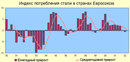 На графике 1 представлена диаграмма, иллюстрирующая развитие рынка стали в странах Европейского Союза за последние 10 лет. Как можно заметить, падение активности на рынке стали наблюдается с периодичностью в 1-1.5 года, как правило, после локальных кризисов в различных региональных экономиках (например, Азиатско-тихоокеанский кризис в 1996-1997 гг., Российский и Южноамериканский кризис 1998 г. и т.п.).