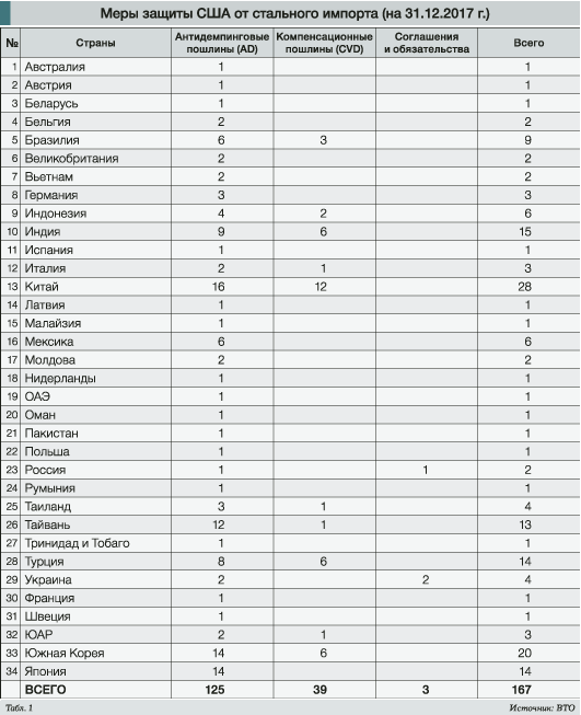 Решение Дональда Трампа по глобальной поддержке американской металлургии для специалистов отрасли не выглядит неожиданным. Власти США давно принимали меры по защите своего стального рынка от демпинга стран-конкурентов, получившие название «стальных войн». К 31 декабря 2017 года, по данным ВТО, действовало 167 ограничений на импорт в США различных видов стальной продукции из 34 стран мира (табл. 1).