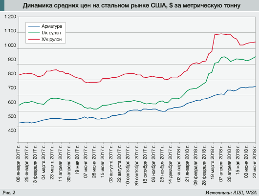 А вот цены американского стального рынка двинулись вверх опережающими темпами, не ожидая ни апреля, ни мая. Достаточно было слухов о подготовке правительственных решений по ограничению импорта стали в начале 2018 года (рис. 2).