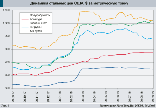 Мы уже писали о первых последствиях этих шагов в статье «Глобальное импортозамещение» от 3 июля 2018 года. Напомним, что наиболее ярким последствием ввода 25%-х глобальных пошлин на импорт стальной продукции в США явился рост американских стальных цен именно на 25% и более (рис.1).