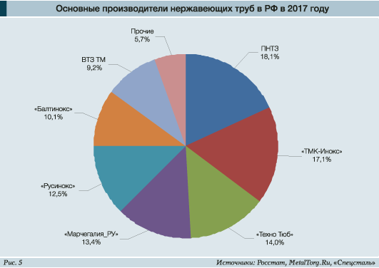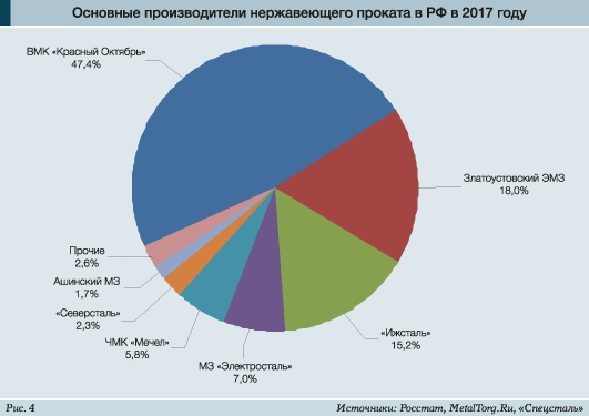 В 2018 году по итогам 9 месяцев доля игроков на рынке нержавейки РФ (включая трубные предприятия) существенно не изменилась. Снизили производство проката предприятия группы «Мечел» и Ашинский метзавод. Нарастили – метзавод «Электросталь» и Златоустовский ЭМЗ.