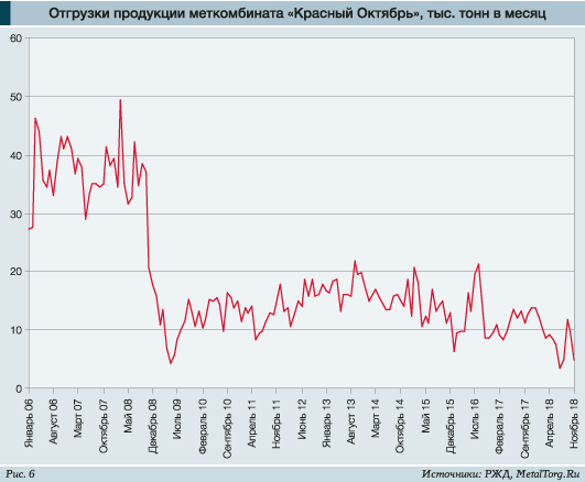 Какая доля организационных усилий и новых кредитов досталась реальному производству, можно судить по динамике ж/д отгрузок продукции ВМЗ и ВМК «Красный Октябрь» в течение последних лет (рис. 6).