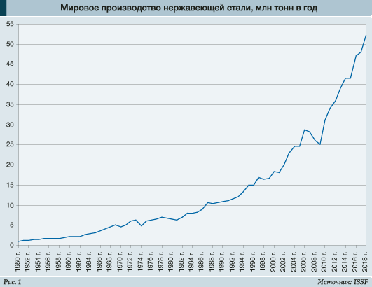 Во всём мире выпуск и применение нержавеющих и прочих коррозионно-стойких сталей продолжает стремительно расти. По ноябрьскому прогнозу британского аналитического агентства MEPS International Ltd, мировое производство нержавеющей стали в 2018 году достигнет рекордного уровня 51,75 млн т, то есть прибавит 7,6% по сравнению с предыдущим, тоже рекордным, показателем.