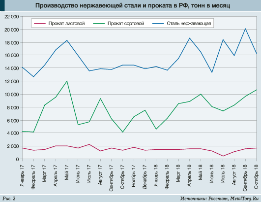 Производство в РФ металлопроката из нержавеющих сталей по итогам января–октября 2018 года, по данным Росстата, выросло на 9,94% в годовом сравнении, до объёма 99,45 тыс. т. Наиболее динамичным стал выпуск сортового проката (включая трубную заготовку), который увеличился на 19,4% до 82,2 тыс. т. При этом объёмы выпуска горячекатаного плоского проката в РФ продолжили снижение (-18,4%) и составили всего лишь 13,56 тыс. т. Х/к лист показал ещё более быстрый спад (-32,3%) до незначительного объёма 2,29 тыс. т. Официальная статистика сообщает также о выпуске профилей, штамповок, гибок и т.п. продукции из нержавейки дальнейшего передела в сравнительно стабильном объёме около 192 тыс. т, но явно с применением импортного проката.