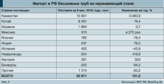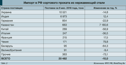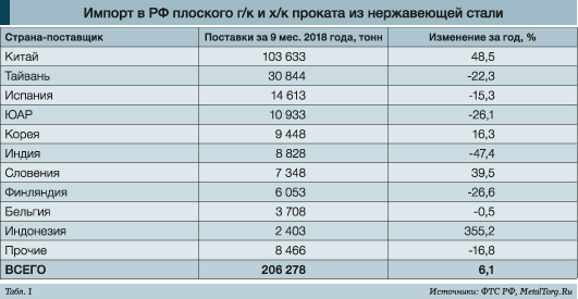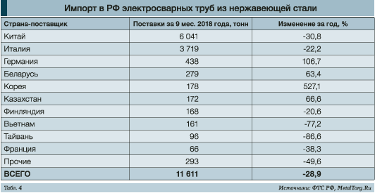 Спрос на нержавейку в России больше объёмов внутреннего производства, которое дополняется в последние годы растущим потоком импорта. В январе–сентябре 2018 года, согласно данным ФТС, импорт в РФ всех видов металлопродукции из коррозионно-стойких (нержавеющих) сталей вырос на 6,3% в годовом сравнении, до 302,5 тыс. т. В этом объёме поставки в Россию нержавеющей стали в форме первичных полуфабрикатов (заготовок) являются незначительными и их доля не превышает 1%. А основной поток нержавеющего импорта в РФ составляют готовый прокат и трубы (см. табл. 1–4).