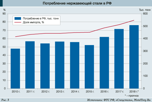 При весьма позитивной динамике потребления нержавейки в РФ в последние годы тревожит неуклонный рост на нашем рынке доли импортной металлопродукции (рис. 3). По прогнозу на 2018 год в целом, за счёт неё будет удовлетворено более чем 80% общероссийского спроса на нержавеющую сталь.