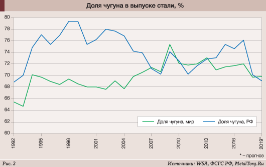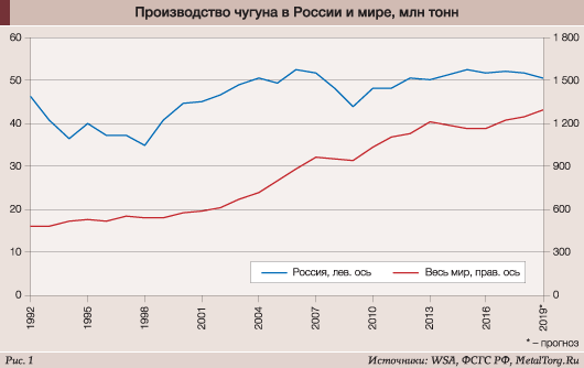 Российский выпуск чугуна с начала текущего века держится на уровне 50 млн т в год с некоторым спадом на период кризиса 2008 года. Небольшое сокращение объемов производства ожидается также по итогам 2019 года (рис. 1).