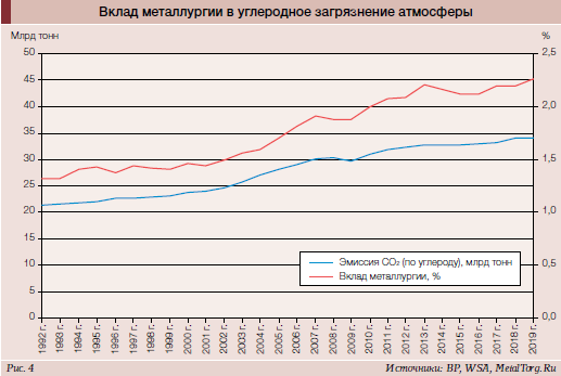 Вклад этот весьма невелик, хотя доля его в последние десятилетия растет заметными темпами. Главная причина этого – быстрая индустриализация Китая с опережающим ростом черной металлургии (до 52% мирового выпуска стали), причем с наиболее грязным (по эмиссии СО2) доменным процессом с использованием угля (кокса). А доля переработки металлолома сравнительно чистым электроплавильным производством остается в Китае очень низкой.