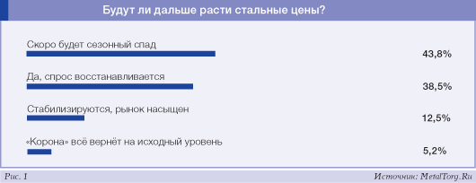 Опрос посетителей сайта MetalTorg.Ru, проведенный в ноябре 2020 года, дал привычный и логичный перед наступлением зимы результат. После затяжного и неспешного роста стальных цен большинство участников российского рынка ожидало их традиционного сезонного снижения (рис. 1).