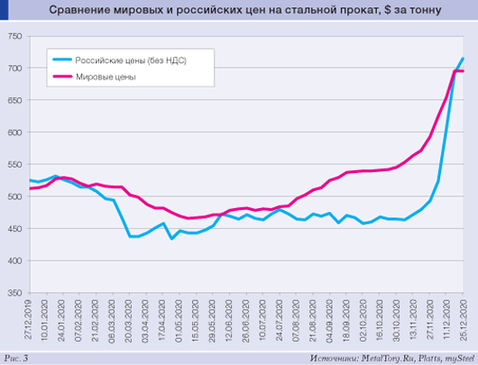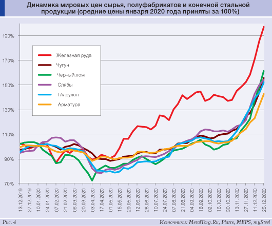 Все цены мирового горно-металлургического комплекса двинулись вверх с весны 2020 года, когда первая волна пандемии COVID-19 начала притихать в ряде стран. Наиболее заметно стали расти цены импорта железорудного сырья (ЖРС) в Китай, превысившего к ноябрю объем 1 млрд т (+10,9% за год). Китайская металлургия выздоровела первой и почти весь год ощущала дефицит поставок основного сырья, особенно бразильского.