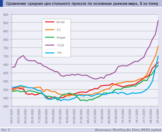 Рекордный по ценам стальной рынок США продемонстрировал в 2020 году не столько рост, сколько нестабильность. Отсеченный от мирового рынка 25%-ми пошлинами и прочими ограничениями на стальной импорт, он практически лишился конкуренции и «свободы маневра» у потребителей. Американская черная металлургия обвалилась по объемам на 40% в апреле–июле и далека от восстановления до сих пор. По итогам 11 месяцев спад производства стали в США составил 17,9%, что выше, чем у конкурентов. Поэтому рост цен на стальную продукцию, стартовавший в августе, отражает фактический дефицит, особенно заметный для плоского металлопроката. В конце 2020 года цены США на стальной рулон по очереди (CRC, далее HRC) опробовали порог в $1000 за метрическую тонну. И завершения этого процесса отделения американского рынка от экономики прочего мира пока не видно. К тому же высокие средние цены США на стальной прокат за год прибавили в среднем еще 44%.