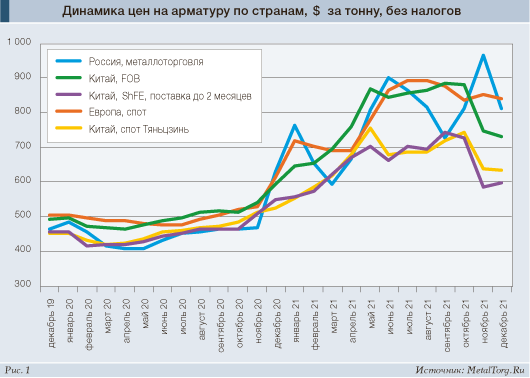 Невзирая на завершившийся строительный сезон, на стыке 2020 и 2021 годов рекордно подорожала стальная арматура. В довольно теплом Китае, где сезонность выражена слабее, а конкуренция – сильнее, этот процесс был небыстрым. Но западнее и севернее цены строительной металлопродукции уверенно шли вверх, причем наиболее активно – в заснеженной к январю России (рис. 1).