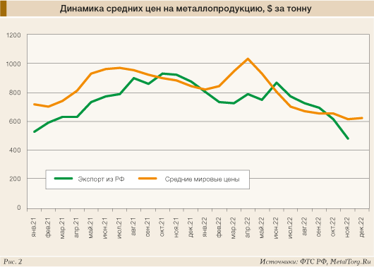 По таможенной статистике за 10 месяцев 2022 года суммарные потери объемов экспорта составили около 4,5 млн т (-13,5%), а потери в стоимости – около $3 млрд (-12,9%). Последний показатель оказался лучше ожиданий, хотя ранее наши металлурги, например «Северсталь», неоднократно жаловались на возникшую необходимость демпинговать на новых рынках. Однако отметим, что пониженные цены традиционно являлись конкурентным преимуществом стального экспорта из РФ (рис. 2).