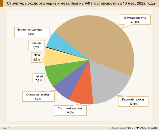 Снизились поставки на экспорт российских стальных труб (-26,3%), что частично было компенсировано ростом их средней стоимости (с $1037 до $1349 за т). Еще заметнее (-43,4% по объемам) сократились поставки стабильных в цене стальных рельсов. Итоговая структура стоимости экспорта продукции черной металлургии РФ по итогам 10 месяцев 2022 года приведена на рис. 3.