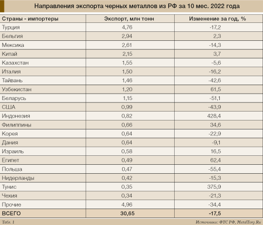 Снизили свою активность и другие импортеры Евросоюза, причем это только начало проблем ввиду запретительного характера соответствующих антироссийских санкций. Рост поставок в ряд азиатских стран, а также в Израиль, Египет и Тунис этих потерь не компенсирует. Диверсификация направлений также не помогает, поскольку прочие 70 стран в нашем списке за 10 месяцев 2022 года импортировали продукции из российских черных металлов на 34,4%, или 2,7 млн т, меньше, чем за тот же период предыдущего года.